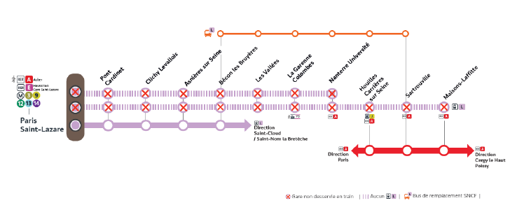 Des bus de remplacement circuleront entre Sartrouville et Cergy-le-Haut, avec desserte de toutes les gares intermédiaires.